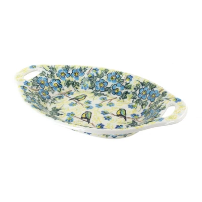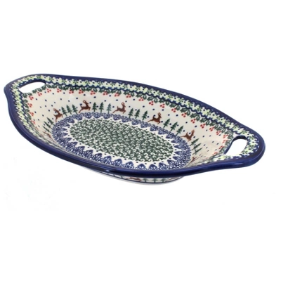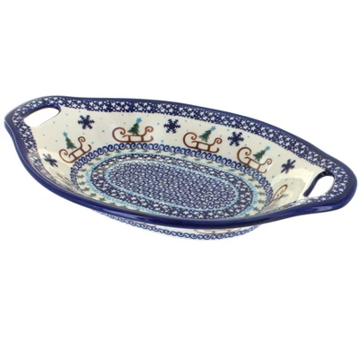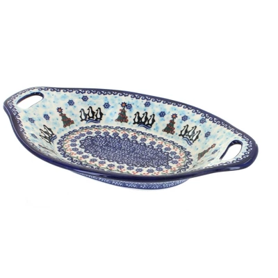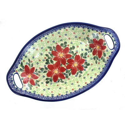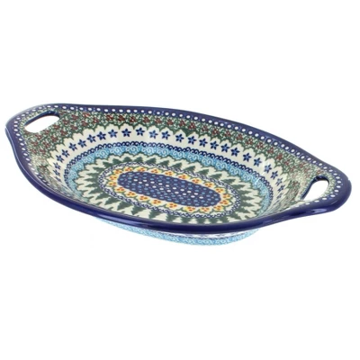 A great tray with handles for bread or appetizers! 12.5″ x 7.75″ The Art of Polish Pottery, as we know it today, started as local folk art centuries ago in the German province of Silesia. The first known pieces of “Bunzlauer” stoneware dating back to the 16th century were crafted by hand and decorated with a folk art stamping technique using potatoes. Original designs were inspired by the peacock feather using the colors of cobalt blue, sage green and ferrous red. These designs and colors are still the inspiration for modern day patterns.Today, skilled Polish artists still individually handcraft and hand decorate each piece using small sponges to stamp each pattern and color. After the process of mixing ingredients, molding the pottery, applying the decorations and glaze, the pottery is twice fired. This process makes the pottery extremely durable, it will not crack or chip easily, and it is perfect for use in the microwave, dishwasher, oven and freezer. Along with our pottery, we have sourced a range of absolutely beautiful hand blown glassware from Poland. It is the perfect addition to your Polish Pottery Collection!