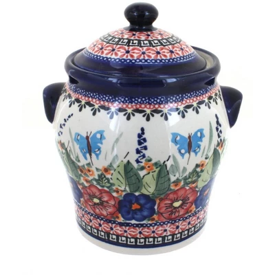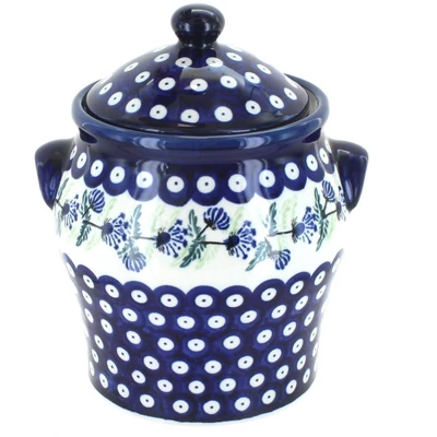 6.3 cup capacity, 8.0″ high The Art of Polish Pottery, as we know it today, started as local folk art centuries ago in the German province of Silesia. The first known pieces of “Bunzlauer” stoneware dating back to the 16th century were crafted by hand and decorated with a folk art stamping technique using potatoes. Original designs were inspired by the peacock feather using the colors of cobalt blue, sage green and ferrous red. These designs and colors are still the inspiration for modern day patterns.Today, skilled Polish artists still individually handcraft and hand decorate each piece using small sponges to stamp each pattern and color. After the process of mixing ingredients, molding the pottery, applying the decorations and glaze, the pottery is twice fired. This process makes the pottery extremely durable, it will not crack or chip easily, and it is perfect for use in the microwave, dishwasher, oven and freezer. Along with our pottery, we have sourced a range of absolutely beautiful hand blown glassware from Poland. It is the perfect addition to your Polish Pottery Collection!