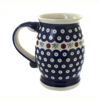 A take on traditional steins, serve your favorite brew in beer mugs by Zaklady. Naturally insulated ceramic keeps your drink at the temperature you want, making it an ideal choice from porters to lagers and stouts. 24 oz. capacity, 5.5 inches high. The Art of Polish Pottery, as we know it today, started as local folk art centuries ago in the German province of Silesia. The first known pieces of “Bunzlauer” stoneware dating back to the 16th century were crafted by hand and decorated with a folk art stamping technique using potatoes. Original designs were inspired by the peacock feather using the colors of cobalt blue, sage green and ferrous red. These designs and colors are still the inspiration for modern day patterns.Today, skilled Polish artists still individually handcraft and hand decorate each piece using small sponges to stamp each pattern and color. After the process of mixing ingredients, molding the pottery, applying the decorations and glaze, the pottery is twice fired. This process makes the pottery extremely durable, it will not crack or chip easily, and it is perfect for use in the microwave, dishwasher, oven and freezer. Along with our pottery, we have sourced a range of absolutely beautiful hand blown glassware from Poland. It is the perfect addition to your Polish Pottery Collection!