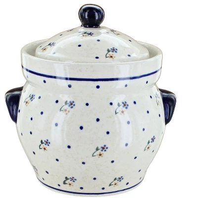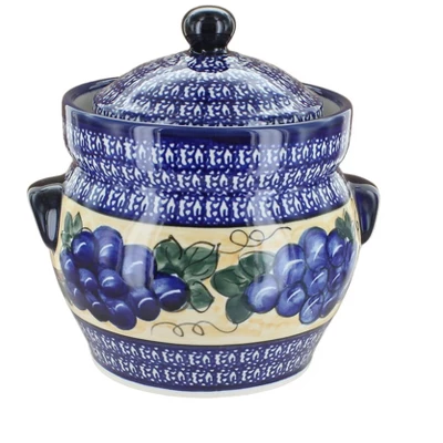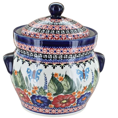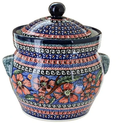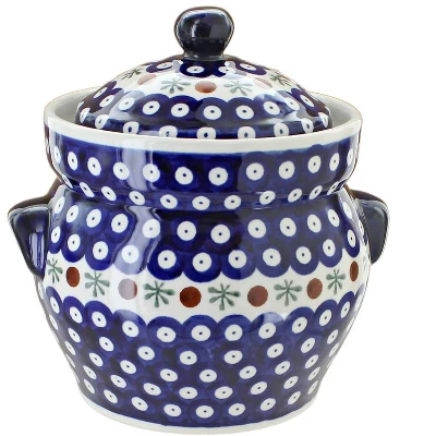 Small canister – 7.5″ high and holds 7.6 cups The Art of Polish Pottery, as we know it today, started as local folk art centuries ago in the German province of Silesia. The first known pieces of “Bunzlauer” stoneware dating back to the 16th century were crafted by hand and decorated with a folk art stamping technique using potatoes. Original designs were inspired by the peacock feather using the colors of cobalt blue, sage green and ferrous red. These designs and colors are still the inspiration for modern day patterns.Today, skilled Polish artists still individually handcraft and hand decorate each piece using small sponges to stamp each pattern and color. After the process of mixing ingredients, molding the pottery, applying the decorations and glaze, the pottery is twice fired. This process makes the pottery extremely durable, it will not crack or chip easily, and it is perfect for use in the microwave, dishwasher, oven and freezer. Along with our pottery, we have sourced a range of absolutely beautiful hand blown glassware from Poland. It is the perfect addition to your Polish Pottery Collection!