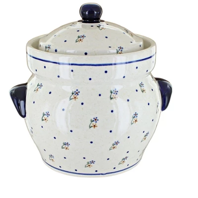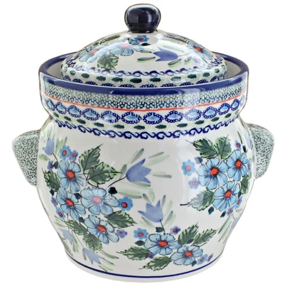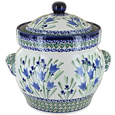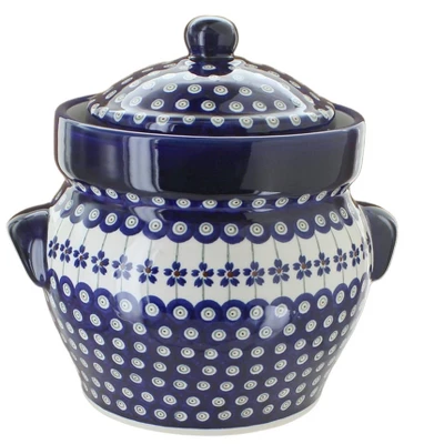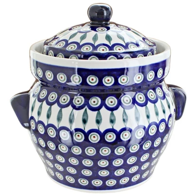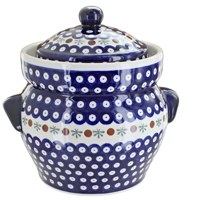 Medium Container – 9″ tall and holds 15 cups. The Art of Polish Pottery, as we know it today, started as local folk art centuries ago in the German province of Silesia. The first known pieces of “Bunzlauer” stoneware dating back to the 16th century were crafted by hand and decorated with a folk art stamping technique using potatoes. Original designs were inspired by the peacock feather using the colors of cobalt blue, sage green and ferrous red. These designs and colors are still the inspiration for modern day patterns.Today, skilled Polish artists still individually handcraft and hand decorate each piece using small sponges to stamp each pattern and color. After the process of mixing ingredients, molding the pottery, applying the decorations and glaze, the pottery is twice fired. This process makes the pottery extremely durable, it will not crack or chip easily, and it is perfect for use in the microwave, dishwasher, oven and freezer. Along with our pottery, we have sourced a range of absolutely beautiful hand blown glassware from Poland. It is the perfect addition to your Polish Pottery Collection!