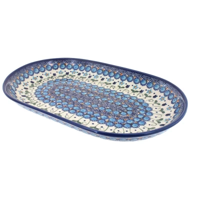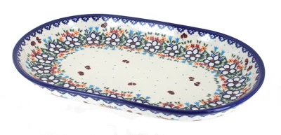 Each one of our serving platters is shaped and decorated by hand, while glazed and high fired to long-lasting quality. Choose the size and pattern to fit your personal tastes. 12.75 inches x 8 inches. The Art of Polish Pottery, as we know it today, started as local folk art centuries ago in the German province of Silesia. The first known pieces of “Bunzlauer” stoneware dating back to the 16th century were crafted by hand and decorated with a folk art stamping technique using potatoes. Original designs were inspired by the peacock feather using the colors of cobalt blue, sage green and ferrous red. These designs and colors are still the inspiration for modern day patterns.Today, skilled Polish artists still individually handcraft and hand decorate each piece using small sponges to stamp each pattern and color. After the process of mixing ingredients, molding the pottery, applying the decorations and glaze, the pottery is twice fired. This process makes the pottery extremely durable, it will not crack or chip easily, and it is perfect for use in the microwave, dishwasher, oven and freezer. Along with our pottery, we have sourced a range of absolutely beautiful hand blown glassware from Poland. It is the perfect addition to your Polish Pottery Collection!