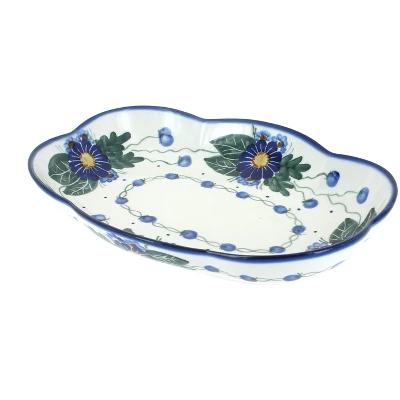 Great shape – perfect for appetizers or desserts for your next party! 9.25″ x 6.75″x1″ deep. The Art of Polish Pottery, as we know it today, started as local folk art centuries ago in the German province of Silesia. The first known pieces of “Bunzlauer” stoneware dating back to the 16th century were crafted by hand and decorated with a folk art stamping technique using potatoes. Original designs were inspired by the peacock feather using the colors of cobalt blue, sage green and ferrous red. These designs and colors are still the inspiration for modern day patterns.Today, skilled Polish artists still individually handcraft and hand decorate each piece using small sponges to stamp each pattern and color. After the process of mixing ingredients, molding the pottery, applying the decorations and glaze, the pottery is twice fired. This process makes the pottery extremely durable, it will not crack or chip easily, and it is perfect for use in the microwave, dishwasher, oven and freezer. Along with our pottery, we have sourced a range of absolutely beautiful hand blown glassware from Poland. It is the perfect addition to your Polish Pottery Collection!