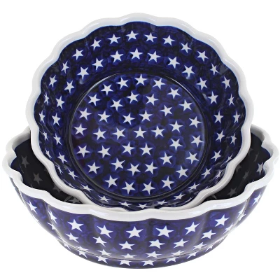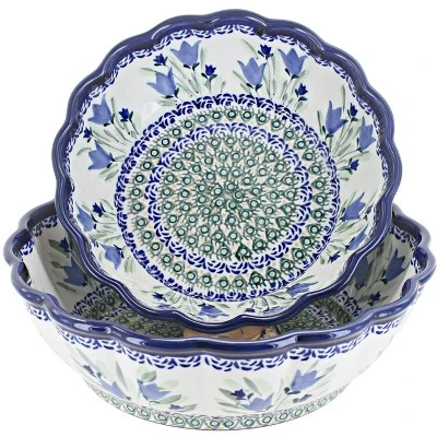 Two of our most popular pieces now priced as a set! Includes our medium and large scallop bowls. Medium – 8″ diameter, large – 9.25″ diameter! The Art of Polish Pottery, as we know it today, started as local folk art centuries ago in the German province of Silesia. The first known pieces of “Bunzlauer” stoneware dating back to the 16th century were crafted by hand and decorated with a folk art stamping technique using potatoes. Original designs were inspired by the peacock feather using the colors of cobalt blue, sage green and ferrous red. These designs and colors are still the inspiration for modern day patterns.Today, skilled Polish artists still individually handcraft and hand decorate each piece using small sponges to stamp each pattern and color. After the process of mixing ingredients, molding the pottery, applying the decorations and glaze, the pottery is twice fired. This process makes the pottery extremely durable, it will not crack or chip easily, and it is perfect for use in the microwave, dishwasher, oven and freezer. Along with our pottery, we have sourced a range of absolutely beautiful hand blown glassware from Poland. It is the perfect addition to your Polish Pottery Collection!
