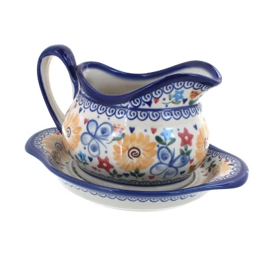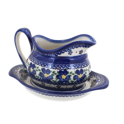 A great way to serve gravy and catch the drips – plate – 8.75″ x 6.5″, gravy bowl – 2.5 cup capacity! The Art of Polish Pottery, as we know it today, started as local folk art centuries ago in the German province of Silesia. The first known pieces of “Bunzlauer” stoneware dating back to the 16th century were crafted by hand and decorated with a folk art stamping technique using potatoes. Original designs were inspired by the peacock feather using the colors of cobalt blue, sage green and ferrous red. These designs and colors are still the inspiration for modern day patterns.Today, skilled Polish artists still individually handcraft and hand decorate each piece using small sponges to stamp each pattern and color. After the process of mixing ingredients, molding the pottery, applying the decorations and glaze, the pottery is twice fired. This process makes the pottery extremely durable, it will not crack or chip easily, and it is perfect for use in the microwave, dishwasher, oven and freezer. Along with our pottery, we have sourced a range of absolutely beautiful hand blown glassware from Poland. It is the perfect addition to your Polish Pottery Collection!