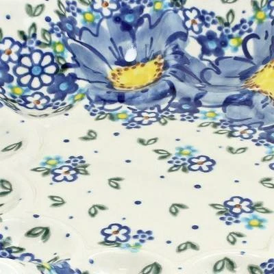 Egg Plate – perfect to showcase your deviled eggs! Holds 12 eggs perfectly – and is easy to store as well! 9″ diameter The Art of Polish Pottery, as we know it today, started as local folk art centuries ago in the German province of Silesia. The first known pieces of “Bunzlauer” stoneware dating back to the 16th century were crafted by hand and decorated with a folk art stamping technique using potatoes. Original designs were inspired by the peacock feather using the colors of cobalt blue, sage green and ferrous red. These designs and colors are still the inspiration for modern day patterns.Today, skilled Polish artists still individually handcraft and hand decorate each piece using small sponges to stamp each pattern and color. After the process of mixing ingredients, molding the pottery, applying the decorations and glaze, the pottery is twice fired. This process makes the pottery extremely durable, it will not crack or chip easily, and it is perfect for use in the microwave, dishwasher, oven and freezer. Along with our pottery, we have sourced a range of absolutely beautiful hand blown glassware from Poland. It is the perfect addition to your Polish Pottery Collection!