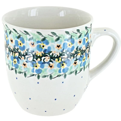 Sip your morning coffee, hot cocoa, and cozy teas from our durable ceramic mugs. A classic silhouette and painted designs offer a comfortable and stylish option while the glaze protects from coffee stains. Dishwasher safe for convenient cleanup. 4 inches tall, 14 oz. The Art of Polish Pottery, as we know it today, started as local folk art centuries ago in the German province of Silesia. The first known pieces of “Bunzlauer” stoneware dating back to the 16th century were crafted by hand and decorated with a folk art stamping technique using potatoes. Original designs were inspired by the peacock feather using the colors of cobalt blue, sage green and ferrous red. These designs and colors are still the inspiration for modern day patterns.Today, skilled Polish artists still individually handcraft and hand decorate each piece using small sponges to stamp each pattern and color. After the process of mixing ingredients, molding the pottery, applying the decorations and glaze, the pottery is twice fired. This process makes the pottery extremely durable, it will not crack or chip easily, and it is perfect for use in the microwave, dishwasher, oven and freezer. Along with our pottery, we have sourced a range of absolutely beautiful hand blown glassware from Poland. It is the perfect addition to your Polish Pottery Collection!