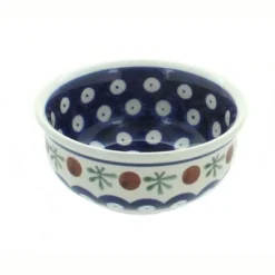 Much requested, great for cooks prep, condiments or sauce. 3.75″ diameter, 1.5″ deep The Art of Polish Pottery, as we know it today, started as local folk art centuries ago in the German province of Silesia. The first known pieces of “Bunzlauer” stoneware dating back to the 16th century were crafted by hand and decorated with a folk art stamping technique using potatoes. Original designs were inspired by the peacock feather using the colors of cobalt blue, sage green and ferrous red. These designs and colors are still the inspiration for modern day patterns.Today, skilled Polish artists still individually handcraft and hand decorate each piece using small sponges to stamp each pattern and color. After the process of mixing ingredients, molding the pottery, applying the decorations and glaze, the pottery is twice fired. This process makes the pottery extremely durable, it will not crack or chip easily, and it is perfect for use in the microwave, dishwasher, oven and freezer. Along with our pottery, we have sourced a range of absolutely beautiful hand blown glassware from Poland. It is the perfect addition to your Polish Pottery Collection!