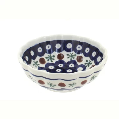 4.5″ diameter x 1.5″ deep, 4 oz. capacity The Art of Polish Pottery, as we know it today, started as local folk art centuries ago in the German province of Silesia. The first known pieces of “Bunzlauer” stoneware dating back to the 16th century were crafted by hand and decorated with a folk art stamping technique using potatoes. Original designs were inspired by the peacock feather using the colors of cobalt blue, sage green and ferrous red. These designs and colors are still the inspiration for modern day patterns.Today, skilled Polish artists still individually handcraft and hand decorate each piece using small sponges to stamp each pattern and color. After the process of mixing ingredients, molding the pottery, applying the decorations and glaze, the pottery is twice fired. This process makes the pottery extremely durable, it will not crack or chip easily, and it is perfect for use in the microwave, dishwasher, oven and freezer. Along with our pottery, we have sourced a range of absolutely beautiful hand blown glassware from Poland. It is the perfect addition to your Polish Pottery Collection!