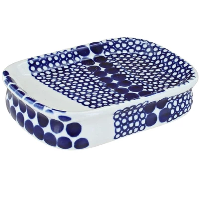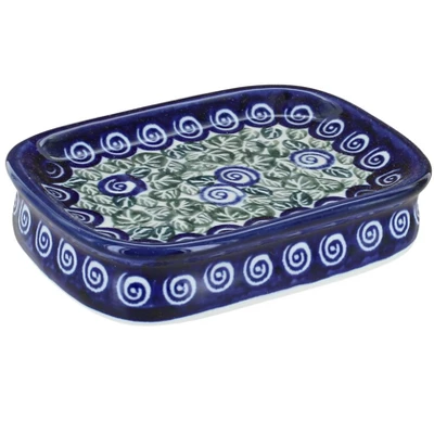 Pair our hand painted soap dish with your other pottery from our ceramic bathroom accessories line. Keep by the bathroom or kitchen sink! 5 inches long x 3.5 inches wide. The Art of Polish Pottery, as we know it today, started as local folk art centuries ago in the German province of Silesia. The first known pieces of “Bunzlauer” stoneware dating back to the 16th century were crafted by hand and decorated with a folk art stamping technique using potatoes. Original designs were inspired by the peacock feather using the colors of cobalt blue, sage green and ferrous red. These designs and colors are still the inspiration for modern day patterns.Today, skilled Polish artists still individually handcraft and hand decorate each piece using small sponges to stamp each pattern and color. After the process of mixing ingredients, molding the pottery, applying the decorations and glaze, the pottery is twice fired. This process makes the pottery extremely durable, it will not crack or chip easily, and it is perfect for use in the microwave, dishwasher, oven and freezer. Along with our pottery, we have sourced a range of absolutely beautiful hand blown glassware from Poland. It is the perfect addition to your Polish Pottery Collection!