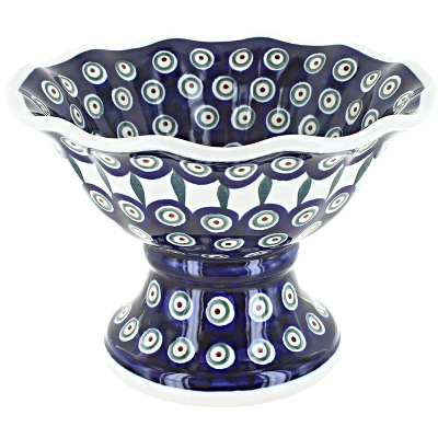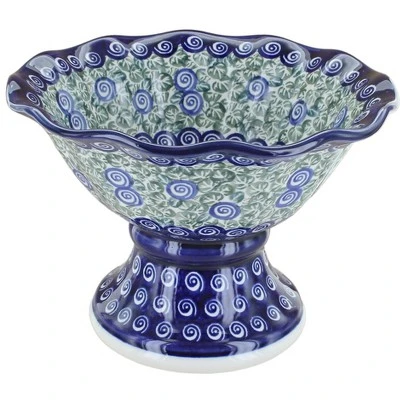 Elegant fruit bowl with scalloped detail is ready for entertaining or everyday use. Fill with fresh fruit as a centerpiece or use to serve a salad orentrée. 7.5 inch diameter x 5.5hes high. The Art of Polish Pottery, as we know it today, started as local folk art centuries ago in the German province of Silesia. The first known pieces of “Bunzlauer” stoneware dating back to the 16th century were crafted by hand and decorated with a folk art stamping technique using potatoes. Original designs were inspired by the peacock feather using the colors of cobalt blue, sage green and ferrous red. These designs and colors are still the inspiration for modern day patterns.Today, skilled Polish artists still individually handcraft and hand decorate each piece using small sponges to stamp each pattern and color. After the process of mixing ingredients, molding the pottery, applying the decorations and glaze, the pottery is twice fired. This process makes the pottery extremely durable, it will not crack or chip easily, and it is perfect for use in the microwave, dishwasher, oven and freezer. Along with our pottery, we have sourced a range of absolutely beautiful hand blown glassware from Poland. It is the perfect addition to your Polish Pottery Collection!