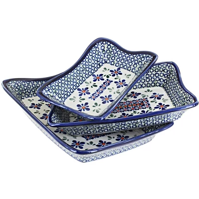Buy all three of our scallop serving trays in a set to fit your entertaining needs. Each piece is crafted by hand from durable ceramic and nestle together for easy storage. Sizes are 6.5″ x 4″, 7.75″ x 5.5″ and 9.5″ x 6.75″. The Art of Polish Pottery, as we know it today, started as local folk art centuries ago in the German province of Silesia. The first known pieces of “Bunzlauer” stoneware dating back to the 16th century were crafted by hand and decorated with a folk art stamping technique using potatoes. Original designs were inspired by the peacock feather using the colors of cobalt blue, sage green and ferrous red. These designs and colors are still the inspiration for modern day patterns.Today, skilled Polish artists still individually handcraft and hand decorate each piece using small sponges to stamp each pattern and color. After the process of mixing ingredients, molding the pottery, applying the decorations and glaze, the pottery is twice fired. This process makes the pottery extremely durable, it will not crack or chip easily, and it is perfect for use in the microwave, dishwasher, oven and freezer. Along with our pottery, we have sourced a range of absolutely beautiful hand blown glassware from Poland. It is the perfect addition to your Polish Pottery Collection!