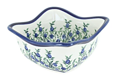 From Zaklady – medium square scallop bowl – great for aa dip or use it as a candy/nut dish! 5.5″ square x 2.5″ deep The Art of Polish Pottery, as we know it today, started as local folk art centuries ago in the German province of Silesia. The first known pieces of “Bunzlauer” stoneware dating back to the 16th century were crafted by hand and decorated with a folk art stamping technique using potatoes. Original designs were inspired by the peacock feather using the colors of cobalt blue, sage green and ferrous red. These designs and colors are still the inspiration for modern day patterns.Today, skilled Polish artists still individually handcraft and hand decorate each piece using small sponges to stamp each pattern and color. After the process of mixing ingredients, molding the pottery, applying the decorations and glaze, the pottery is twice fired. This process makes the pottery extremely durable, it will not crack or chip easily, and it is perfect for use in the microwave, dishwasher, oven and freezer. Along with our pottery, we have sourced a range of absolutely beautiful hand blown glassware from Poland. It is the perfect addition to your Polish Pottery Collection!