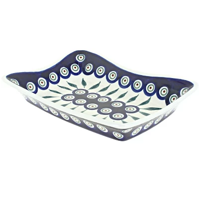 NEW from Zaklady – a medium rectangular serving dish with a scallop edge – perfect for Hors d’oeuvres – or a dip – great for entertaining. 7.75″ long x 5.5″ wide x 1″ deep. The Art of Polish Pottery, as we know it today, started as local folk art centuries ago in the German province of Silesia. The first known pieces of “Bunzlauer” stoneware dating back to the 16th century were crafted by hand and decorated with a folk art stamping technique using potatoes. Original designs were inspired by the peacock feather using the colors of cobalt blue, sage green and ferrous red. These designs and colors are still the inspiration for modern day patterns.Today, skilled Polish artists still individually handcraft and hand decorate each piece using small sponges to stamp each pattern and color. After the process of mixing ingredients, molding the pottery, applying the decorations and glaze, the pottery is twice fired. This process makes the pottery extremely durable, it will not crack or chip easily, and it is perfect for use in the microwave, dishwasher, oven and freezer. Along with our pottery, we have sourced a range of absolutely beautiful hand blown glassware from Poland. It is the perfect addition to your Polish Pottery Collection!
