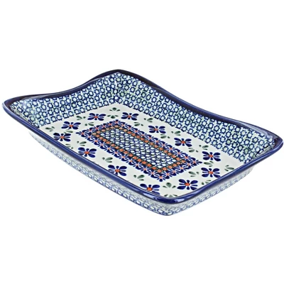 Use as a charcuterie tray or for appetizers, a 1″ scallop lip gives this a unique look that can be paired with other patterns and sizes. 9.5″ long x 6.75″ wide x 1″ deep. The Art of Polish Pottery, as we know it today, started as local folk art centuries ago in the German province of Silesia. The first known pieces of “Bunzlauer” stoneware dating back to the 16th century were crafted by hand and decorated with a folk art stamping technique using potatoes. Original designs were inspired by the peacock feather using the colors of cobalt blue, sage green and ferrous red. These designs and colors are still the inspiration for modern day patterns.Today, skilled Polish artists still individually handcraft and hand decorate each piece using small sponges to stamp each pattern and color. After the process of mixing ingredients, molding the pottery, applying the decorations and glaze, the pottery is twice fired. This process makes the pottery extremely durable, it will not crack or chip easily, and it is perfect for use in the microwave, dishwasher, oven and freezer. Along with our pottery, we have sourced a range of absolutely beautiful hand blown glassware from Poland. It is the perfect addition to your Polish Pottery Collection!