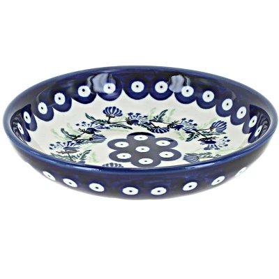 From Zaklady – large shallow bowl – perfect for grab-and-go buffet solutions – use it condiments, tastings or desserts.You’ll want to have several of these for each of your guests! 6.25″ diameter – 1″ deep The Art of Polish Pottery, as we know it today, started as local folk art centuries ago in the German province of Silesia. The first known pieces of “Bunzlauer” stoneware dating back to the 16th century were crafted by hand and decorated with a folk art stamping technique using potatoes. Original designs were inspired by the peacock feather using the colors of cobalt blue, sage green and ferrous red. These designs and colors are still the inspiration for modern day patterns.Today, skilled Polish artists still individually handcraft and hand decorate each piece using small sponges to stamp each pattern and color. After the process of mixing ingredients, molding the pottery, applying the decorations and glaze, the pottery is twice fired. This process makes the pottery extremely durable, it will not crack or chip easily, and it is perfect for use in the microwave, dishwasher, oven and freezer. Along with our pottery, we have sourced a range of absolutely beautiful hand blown glassware from Poland. It is the perfect addition to your Polish Pottery Collection!