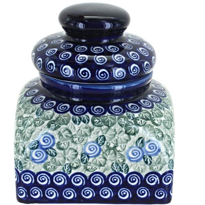 From Zaklady – medium square container – perfect for candy, cookies or dog treats – you can also use in the bathroom for Q-tips, cotton balls or shower balls! Container is 4″ tall without the lid, 5.5″ with the lid on, bottom is 5″ square. The Art of Polish Pottery, as we know it today, started as local folk art centuries ago in the German province of Silesia. The first known pieces of “Bunzlauer” stoneware dating back to the 16th century were crafted by hand and decorated with a folk art stamping technique using potatoes. Original designs were inspired by the peacock feather using the colors of cobalt blue, sage green and ferrous red. These designs and colors are still the inspiration for modern day patterns.Today, skilled Polish artists still individually handcraft and hand decorate each piece using small sponges to stamp each pattern and color. After the process of mixing ingredients, molding the pottery, applying the decorations and glaze, the pottery is twice fired. This process makes the pottery extremely durable, it will not crack or chip easily, and it is perfect for use in the microwave, dishwasher, oven and freezer. Along with our pottery, we have sourced a range of absolutely beautiful hand blown glassware from Poland. It is the perfect addition to your Polish Pottery Collection!