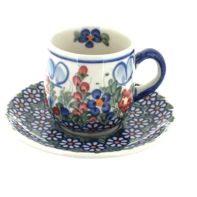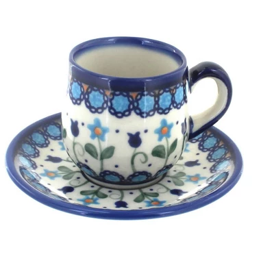 Enjoy your espresso in our most petite mug and saucer. The double-glazed ceramic protects from stains and is dishwasher safe for convenient cleanup. Saucer is 4.75 inches, 2.5 inches tall, holds 3 oz. The Art of Polish Pottery, as we know it today, started as local folk art centuries ago in the German province of Silesia. The first known pieces of “Bunzlauer” stoneware dating back to the 16th century were crafted by hand and decorated with a folk art stamping technique using potatoes. Original designs were inspired by the peacock feather using the colors of cobalt blue, sage green and ferrous red. These designs and colors are still the inspiration for modern day patterns.Today, skilled Polish artists still individually handcraft and hand decorate each piece using small sponges to stamp each pattern and color. After the process of mixing ingredients, molding the pottery, applying the decorations and glaze, the pottery is twice fired. This process makes the pottery extremely durable, it will not crack or chip easily, and it is perfect for use in the microwave, dishwasher, oven and freezer. Along with our pottery, we have sourced a range of absolutely beautiful hand blown glassware from Poland. It is the perfect addition to your Polish Pottery Collection!