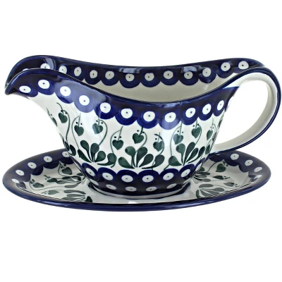 A beautiful, exotic shape and pattern – dish – 9″ x 6″, gravy boat – 2 cup capacity. The Art of Polish Pottery, as we know it today, started as local folk art centuries ago in the German province of Silesia. The first known pieces of “Bunzlauer” stoneware dating back to the 16th century were crafted by hand and decorated with a folk art stamping technique using potatoes. Original designs were inspired by the peacock feather using the colors of cobalt blue, sage green and ferrous red. These designs and colors are still the inspiration for modern day patterns.Today, skilled Polish artists still individually handcraft and hand decorate each piece using small sponges to stamp each pattern and color. After the process of mixing ingredients, molding the pottery, applying the decorations and glaze, the pottery is twice fired. This process makes the pottery extremely durable, it will not crack or chip easily, and it is perfect for use in the microwave, dishwasher, oven and freezer. Along with our pottery, we have sourced a range of absolutely beautiful hand blown glassware from Poland. It is the perfect addition to your Polish Pottery Collection!