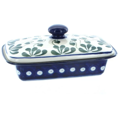 Our covered dish keeps butter fresh for starting your morning or passing around the dinner table. Each piece is hand crafted and painted for an artisan finish. Dishwasher safe. Plate is 6.75 inches x 5 inches. Butter section is 4.5 inches by 3.25 inches. The Art of Polish Pottery, as we know it today, started as local folk art centuries ago in the German province of Silesia. The first known pieces of “Bunzlauer” stoneware dating back to the 16th century were crafted by hand and decorated with a folk art stamping technique using potatoes. Original designs were inspired by the peacock feather using the colors of cobalt blue, sage green and ferrous red. These designs and colors are still the inspiration for modern day patterns.Today, skilled Polish artists still individually handcraft and hand decorate each piece using small sponges to stamp each pattern and color. After the process of mixing ingredients, molding the pottery, applying the decorations and glaze, the pottery is twice fired. This process makes the pottery extremely durable, it will not crack or chip easily, and it is perfect for use in the microwave, dishwasher, oven and freezer. Along with our pottery, we have sourced a range of absolutely beautiful hand blown glassware from Poland. It is the perfect addition to your Polish Pottery Collection!