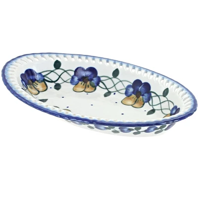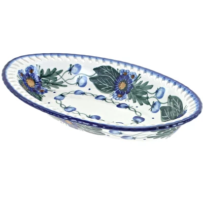 From WR Unikat – Small Oval Dish – perfect for olives or pickles, candies and nuts! 8.25″ x 5″ x 1″ deep! Note the delicate open work edging the dish – georgeous! The Art of Polish Pottery, as we know it today, started as local folk art centuries ago in the German province of Silesia. The first known pieces of “Bunzlauer” stoneware dating back to the 16th century were crafted by hand and decorated with a folk art stamping technique using potatoes. Original designs were inspired by the peacock feather using the colors of cobalt blue, sage green and ferrous red. These designs and colors are still the inspiration for modern day patterns.Today, skilled Polish artists still individually handcraft and hand decorate each piece using small sponges to stamp each pattern and color. After the process of mixing ingredients, molding the pottery, applying the decorations and glaze, the pottery is twice fired. This process makes the pottery extremely durable, it will not crack or chip easily, and it is perfect for use in the microwave, dishwasher, oven and freezer. Along with our pottery, we have sourced a range of absolutely beautiful hand blown glassware from Poland. It is the perfect addition to your Polish Pottery Collection!