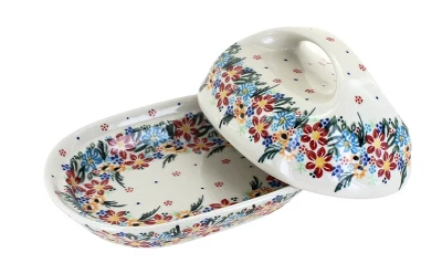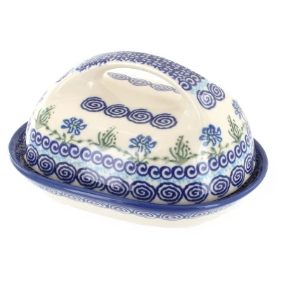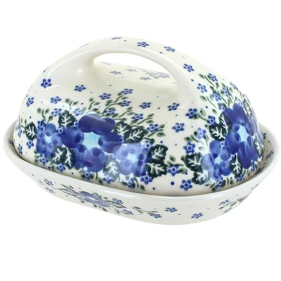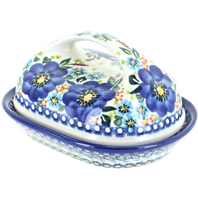 Covered dish with convenient handle keeps butter fresh for starting your morning or passing around the dinner table. Each piece is handcrafted and painted for an artisan finish. Dishwasher safe. 7 inches x 5 inches. Inside is 5 inches x 3.5 inches. The Art of Polish Pottery, as we know it today, started as local folk art centuries ago in the German province of Silesia. The first known pieces of “Bunzlauer” stoneware dating back to the 16th century were crafted by hand and decorated with a folk art stamping technique using potatoes. Original designs were inspired by the peacock feather using the colors of cobalt blue, sage green and ferrous red. These designs and colors are still the inspiration for modern day patterns.Today, skilled Polish artists still individually handcraft and hand decorate each piece using small sponges to stamp each pattern and color. After the process of mixing ingredients, molding the pottery, applying the decorations and glaze, the pottery is twice fired. This process makes the pottery extremely durable, it will not crack or chip easily, and it is perfect for use in the microwave, dishwasher, oven and freezer. Along with our pottery, we have sourced a range of absolutely beautiful hand blown glassware from Poland. It is the perfect addition to your Polish Pottery Collection!