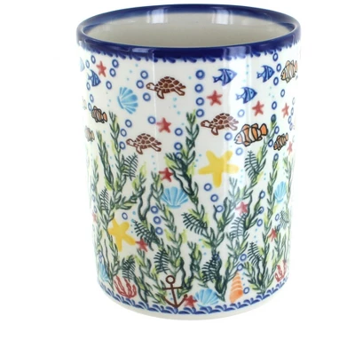 A countertop essential with hand painted designs for both contemporary and traditional kitchens. Sleek ceramic stores kitchen tools or can be used as a wine cooler for entertaining. Dishwasher safe. 6.75 inches tall, 5.25-inch diameter. The Art of Polish Pottery, as we know it today, started as local folk art centuries ago in the German province of Silesia. The first known pieces of “Bunzlauer” stoneware dating back to the 16th century were crafted by hand and decorated with a folk art stamping technique using potatoes. Original designs were inspired by the peacock feather using the colors of cobalt blue, sage green and ferrous red. These designs and colors are still the inspiration for modern day patterns.Today, skilled Polish artists still individually handcraft and hand decorate each piece using small sponges to stamp each pattern and color. After the process of mixing ingredients, molding the pottery, applying the decorations and glaze, the pottery is twice fired. This process makes the pottery extremely durable, it will not crack or chip easily, and it is perfect for use in the microwave, dishwasher, oven and freezer. Along with our pottery, we have sourced a range of absolutely beautiful hand blown glassware from Poland. It is the perfect addition to your Polish Pottery Collection!