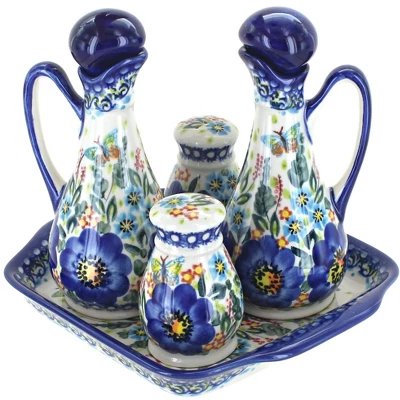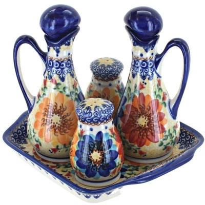 From Vena – Table Accessory Set – inludes Salt Pepper Shakers, Olive Oil Vinegar containers – and a tray to set them on! Tray – 6.5″ x 7.75″, shakers – 3.25″ tall, containers – 6.5″ tall, holds 8 oz. The Art of Polish Pottery, as we know it today, started as local folk art centuries ago in the German province of Silesia. The first known pieces of “Bunzlauer” stoneware dating back to the 16th century were crafted by hand and decorated with a folk art stamping technique using potatoes. Original designs were inspired by the peacock feather using the colors of cobalt blue, sage green and ferrous red. These designs and colors are still the inspiration for modern day patterns.Today, skilled Polish artists still individually handcraft and hand decorate each piece using small sponges to stamp each pattern and color. After the process of mixing ingredients, molding the pottery, applying the decorations and glaze, the pottery is twice fired. This process makes the pottery extremely durable, it will not crack or chip easily, and it is perfect for use in the microwave, dishwasher, oven and freezer. Along with our pottery, we have sourced a range of absolutely beautiful hand blown glassware from Poland. It is the perfect addition to your Polish Pottery Collection!