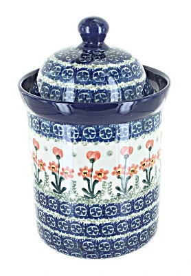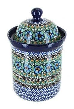A Small Canister from Ceramika Artystyczna -SENSATIONAL FOR STORAGE – Use to Display, Organize Store All Kinds of Snacks Without Cluttering Your Kitchen! 7.75″ tall, holds 4 cups. The Art of Polish Pottery, as we know it today, started as local folk art centuries ago in the German province of Silesia. The first known pieces of “Bunzlauer” stoneware dating back to the 16th century were crafted by hand and decorated with a folk art stamping technique using potatoes. Original designs were inspired by the peacock feather using the colors of cobalt blue, sage green and ferrous red. These designs and colors are still the inspiration for modern day patterns.Today, skilled Polish artists still individually handcraft and hand decorate each piece using small sponges to stamp each pattern and color. After the process of mixing ingredients, molding the pottery, applying the decorations and glaze, the pottery is twice fired. This process makes the pottery extremely durable, it will not crack or chip easily, and it is perfect for use in the microwave, dishwasher, oven and freezer. Along with our pottery, we have sourced a range of absolutely beautiful hand blown glassware from Poland. It is the perfect addition to your Polish Pottery Collection!