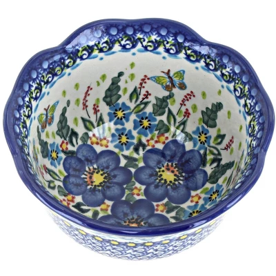 Unique Shaped Bowl with scallop edges from Vena factory – great for an ice cream sundae or use it for salad or cereal! 3.25″ deep x 5.75″ diameter. The Art of Polish Pottery, as we know it today, started as local folk art centuries ago in the German province of Silesia. The first known pieces of “Bunzlauer” stoneware dating back to the 16th century were crafted by hand and decorated with a folk art stamping technique using potatoes. Original designs were inspired by the peacock feather using the colors of cobalt blue, sage green and ferrous red. These designs and colors are still the inspiration for modern day patterns.Today, skilled Polish artists still individually handcraft and hand decorate each piece using small sponges to stamp each pattern and color. After the process of mixing ingredients, molding the pottery, applying the decorations and glaze, the pottery is twice fired. This process makes the pottery extremely durable, it will not crack or chip easily, and it is perfect for use in the microwave, dishwasher, oven and freezer. Along with our pottery, we have sourced a range of absolutely beautiful hand blown glassware from Poland. It is the perfect addition to your Polish Pottery Collection!