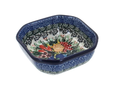 From Ceramika – 4.25″ diameter, 1.5″ tall The Art of Polish Pottery, as we know it today, started as local folk art centuries ago in the German province of Silesia. The first known pieces of “Bunzlauer” stoneware dating back to the 16th century were crafted by hand and decorated with a folk art stamping technique using potatoes. Original designs were inspired by the peacock feather using the colors of cobalt blue, sage green and ferrous red. These designs and colors are still the inspiration for modern day patterns.Today, skilled Polish artists still individually handcraft and hand decorate each piece using small sponges to stamp each pattern and color. After the process of mixing ingredients, molding the pottery, applying the decorations and glaze, the pottery is twice fired. This process makes the pottery extremely durable, it will not crack or chip easily, and it is perfect for use in the microwave, dishwasher, oven and freezer. Along with our pottery, we have sourced a range of absolutely beautiful hand blown glassware from Poland. It is the perfect addition to your Polish Pottery Collection!