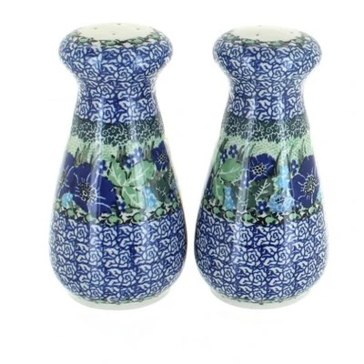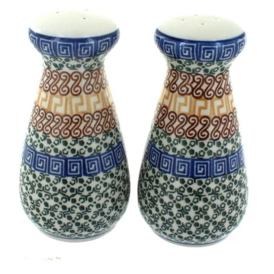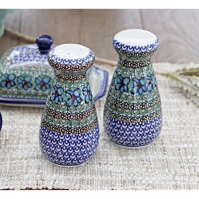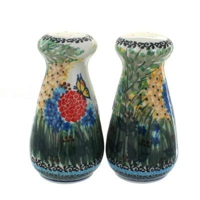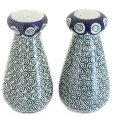 Hand painted salt and pepper shakers in an elegant trumpet silhouette set the table for special occasions and everyday dining alike. Ceramic for weighted stability and durability through years of use. 6 inches tall. The Art of Polish Pottery, as we know it today, started as local folk art centuries ago in the German province of Silesia. The first known pieces of “Bunzlauer” stoneware dating back to the 16th century were crafted by hand and decorated with a folk art stamping technique using potatoes. Original designs were inspired by the peacock feather using the colors of cobalt blue, sage green and ferrous red. These designs and colors are still the inspiration for modern day patterns.Today, skilled Polish artists still individually handcraft and hand decorate each piece using small sponges to stamp each pattern and color. After the process of mixing ingredients, molding the pottery, applying the decorations and glaze, the pottery is twice fired. This process makes the pottery extremely durable, it will not crack or chip easily, and it is perfect for use in the microwave, dishwasher, oven and freezer. Along with our pottery, we have sourced a range of absolutely beautiful hand blown glassware from Poland. It is the perfect addition to your Polish Pottery Collection!