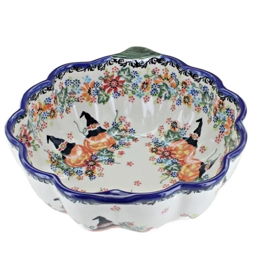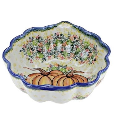 Get ready for Fall with a festive pumpkin bowl! Perfect for get togethers or passing out candy, this fun piece can be used all season long. 8″ Wide 9.25″ Long 3.25″ High The Art of Polish Pottery, as we know it today, started as local folk art centuries ago in the German province of Silesia. The first known pieces of “Bunzlauer” stoneware dating back to the 16th century were crafted by hand and decorated with a folk art stamping technique using potatoes. Original designs were inspired by the peacock feather using the colors of cobalt blue, sage green and ferrous red. These designs and colors are still the inspiration for modern day patterns.Today, skilled Polish artists still individually handcraft and hand decorate each piece using small sponges to stamp each pattern and color. After the process of mixing ingredients, molding the pottery, applying the decorations and glaze, the pottery is twice fired. This process makes the pottery extremely durable, it will not crack or chip easily, and it is perfect for use in the microwave, dishwasher, oven and freezer. Along with our pottery, we have sourced a range of absolutely beautiful hand blown glassware from Poland. It is the perfect addition to your Polish Pottery Collection!