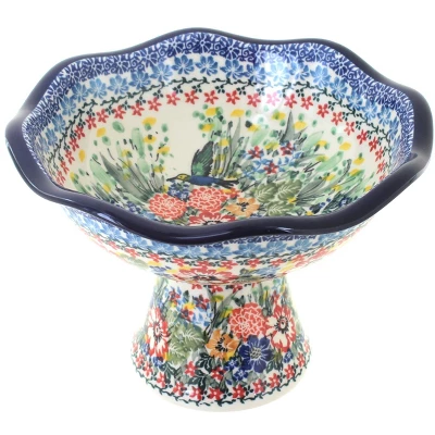 The pedestal candy dish is crafted from ceramic with a modern scalloped edge. Set out pretzels, your favorite candy, or set by the door to use as a key dish! 8 inch diameter, 5.5 inches high. The Art of Polish Pottery, as we know it today, started as local folk art centuries ago in the German province of Silesia. The first known pieces of “Bunzlauer” stoneware dating back to the 16th century were crafted by hand and decorated with a folk art stamping technique using potatoes. Original designs were inspired by the peacock feather using the colors of cobalt blue, sage green and ferrous red. These designs and colors are still the inspiration for modern day patterns.Today, skilled Polish artists still individually handcraft and hand decorate each piece using small sponges to stamp each pattern and color. After the process of mixing ingredients, molding the pottery, applying the decorations and glaze, the pottery is twice fired. This process makes the pottery extremely durable, it will not crack or chip easily, and it is perfect for use in the microwave, dishwasher, oven and freezer. Along with our pottery, we have sourced a range of absolutely beautiful hand blown glassware from Poland. It is the perfect addition to your Polish Pottery Collection!