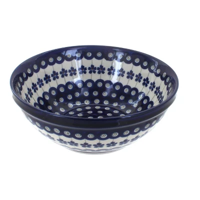 1.25 Qt. capacity, 7.75″ diameter x 3.0″ deep The Art of Polish Pottery, as we know it today, started as local folk art centuries ago in the German province of Silesia. The first known pieces of “Bunzlauer” stoneware dating back to the 16th century were crafted by hand and decorated with a folk art stamping technique using potatoes. Original designs were inspired by the peacock feather using the colors of cobalt blue, sage green and ferrous red. These designs and colors are still the inspiration for modern day patterns.Today, skilled Polish artists still individually handcraft and hand decorate each piece using small sponges to stamp each pattern and color. After the process of mixing ingredients, molding the pottery, applying the decorations and glaze, the pottery is twice fired. This process makes the pottery extremely durable, it will not crack or chip easily, and it is perfect for use in the microwave, dishwasher, oven and freezer. Along with our pottery, we have sourced a range of absolutely beautiful hand blown glassware from Poland. It is the perfect addition to your Polish Pottery Collection!