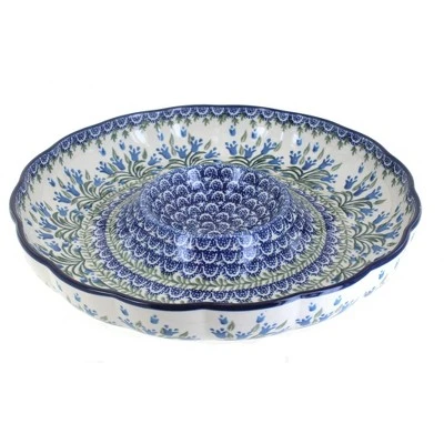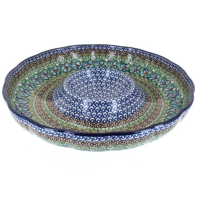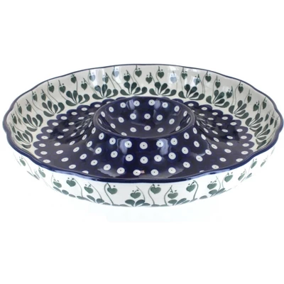 A special piece from Ceramika! – Great chip/vegetable and dip plate! – 12″ diameter and 1.75″ deep. The Art of Polish Pottery, as we know it today, started as local folk art centuries ago in the German province of Silesia. The first known pieces of “Bunzlauer” stoneware dating back to the 16th century were crafted by hand and decorated with a folk art stamping technique using potatoes. Original designs were inspired by the peacock feather using the colors of cobalt blue, sage green and ferrous red. These designs and colors are still the inspiration for modern day patterns.Today, skilled Polish artists still individually handcraft and hand decorate each piece using small sponges to stamp each pattern and color. After the process of mixing ingredients, molding the pottery, applying the decorations and glaze, the pottery is twice fired. This process makes the pottery extremely durable, it will not crack or chip easily, and it is perfect for use in the microwave, dishwasher, oven and freezer. Along with our pottery, we have sourced a range of absolutely beautiful hand blown glassware from Poland. It is the perfect addition to your Polish Pottery Collection!