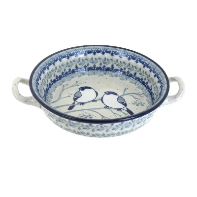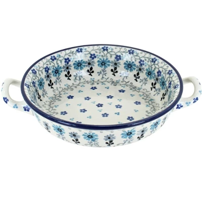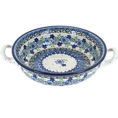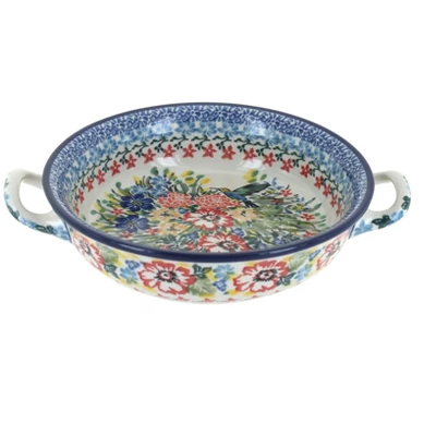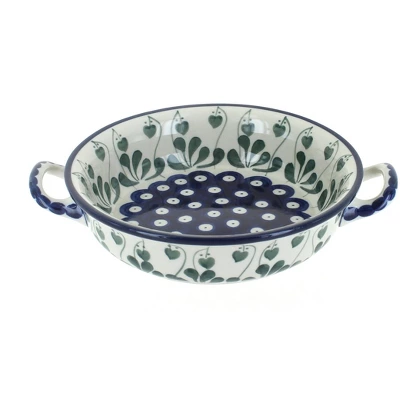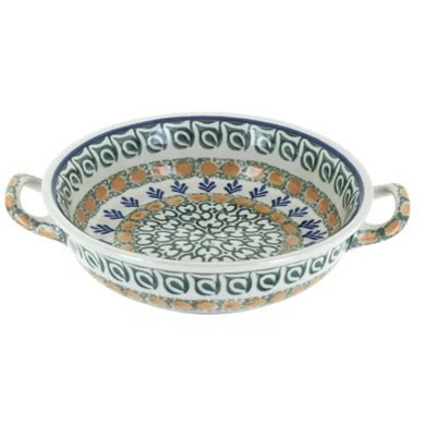 Mini casserole dish with handles – great for individual dishes – or a cheese dip. 6.5″ diameter x 1.5″ deep The Art of Polish Pottery, as we know it today, started as local folk art centuries ago in the German province of Silesia. The first known pieces of “Bunzlauer” stoneware dating back to the 16th century were crafted by hand and decorated with a folk art stamping technique using potatoes. Original designs were inspired by the peacock feather using the colors of cobalt blue, sage green and ferrous red. These designs and colors are still the inspiration for modern day patterns.Today, skilled Polish artists still individually handcraft and hand decorate each piece using small sponges to stamp each pattern and color. After the process of mixing ingredients, molding the pottery, applying the decorations and glaze, the pottery is twice fired. This process makes the pottery extremely durable, it will not crack or chip easily, and it is perfect for use in the microwave, dishwasher, oven and freezer. Along with our pottery, we have sourced a range of absolutely beautiful hand blown glassware from Poland. It is the perfect addition to your Polish Pottery Collection!