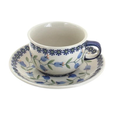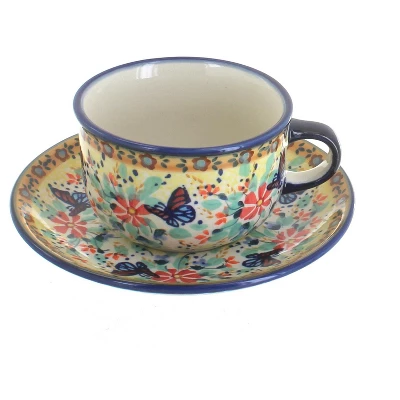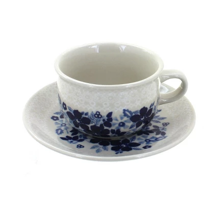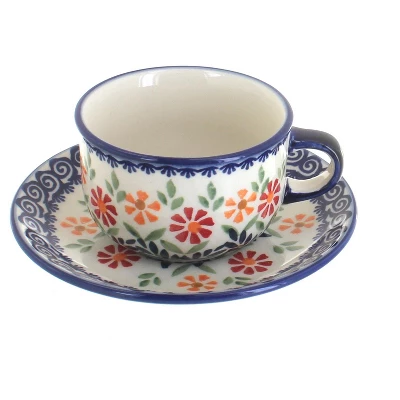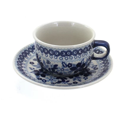 From Manufaktura – Saucer: 6″ diameter, Cup: 7 oz. capacity The Art of Polish Pottery, as we know it today, started as local folk art centuries ago in the German province of Silesia. The first known pieces of “Bunzlauer” stoneware dating back to the 16th century were crafted by hand and decorated with a folk art stamping technique using potatoes. Original designs were inspired by the peacock feather using the colors of cobalt blue, sage green and ferrous red. These designs and colors are still the inspiration for modern day patterns.Today, skilled Polish artists still individually handcraft and hand decorate each piece using small sponges to stamp each pattern and color. After the process of mixing ingredients, molding the pottery, applying the decorations and glaze, the pottery is twice fired. This process makes the pottery extremely durable, it will not crack or chip easily, and it is perfect for use in the microwave, dishwasher, oven and freezer. Along with our pottery, we have sourced a range of absolutely beautiful hand blown glassware from Poland. It is the perfect addition to your Polish Pottery Collection!