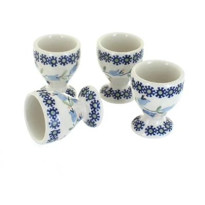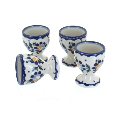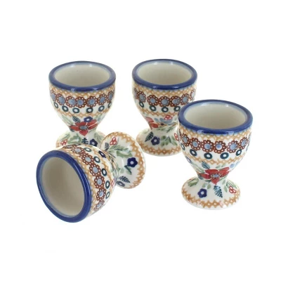 Set includes 4 egg cups – Each 2.5″ tall The Art of Polish Pottery, as we know it today, started as local folk art centuries ago in the German province of Silesia. The first known pieces of “Bunzlauer” stoneware dating back to the 16th century were crafted by hand and decorated with a folk art stamping technique using potatoes. Original designs were inspired by the peacock feather using the colors of cobalt blue, sage green and ferrous red. These designs and colors are still the inspiration for modern day patterns.Today, skilled Polish artists still individually handcraft and hand decorate each piece using small sponges to stamp each pattern and color. After the process of mixing ingredients, molding the pottery, applying the decorations and glaze, the pottery is twice fired. This process makes the pottery extremely durable, it will not crack or chip easily, and it is perfect for use in the microwave, dishwasher, oven and freezer. Along with our pottery, we have sourced a range of absolutely beautiful hand blown glassware from Poland. It is the perfect addition to your Polish Pottery Collection!