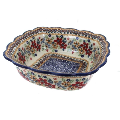 Exquisite serving dish with a scallop edge – beautiful details! 9″ square x 3″ deep! The Art of Polish Pottery, as we know it today, started as local folk art centuries ago in the German province of Silesia. The first known pieces of “Bunzlauer” stoneware dating back to the 16th century were crafted by hand and decorated with a folk art stamping technique using potatoes. Original designs were inspired by the peacock feather using the colors of cobalt blue, sage green and ferrous red. These designs and colors are still the inspiration for modern day patterns.Today, skilled Polish artists still individually handcraft and hand decorate each piece using small sponges to stamp each pattern and color. After the process of mixing ingredients, molding the pottery, applying the decorations and glaze, the pottery is twice fired. This process makes the pottery extremely durable, it will not crack or chip easily, and it is perfect for use in the microwave, dishwasher, oven and freezer. Along with our pottery, we have sourced a range of absolutely beautiful hand blown glassware from Poland. It is the perfect addition to your Polish Pottery Collection!