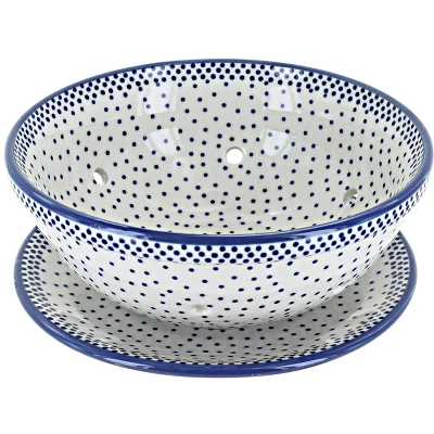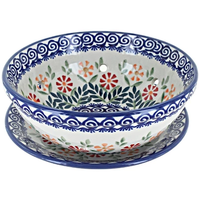 Small Berry Bowl – great for blueberries or raspberries! Saucer – 6.75: diameter, Bowl – 6.5″ diameter x 2.75″ high – holes for drainage of course! The Art of Polish Pottery, as we know it today, started as local folk art centuries ago in the German province of Silesia. The first known pieces of “Bunzlauer” stoneware dating back to the 16th century were crafted by hand and decorated with a folk art stamping technique using potatoes. Original designs were inspired by the peacock feather using the colors of cobalt blue, sage green and ferrous red. These designs and colors are still the inspiration for modern day patterns.Today, skilled Polish artists still individually handcraft and hand decorate each piece using small sponges to stamp each pattern and color. After the process of mixing ingredients, molding the pottery, applying the decorations and glaze, the pottery is twice fired. This process makes the pottery extremely durable, it will not crack or chip easily, and it is perfect for use in the microwave, dishwasher, oven and freezer. Along with our pottery, we have sourced a range of absolutely beautiful hand blown glassware from Poland. It is the perfect addition to your Polish Pottery Collection!