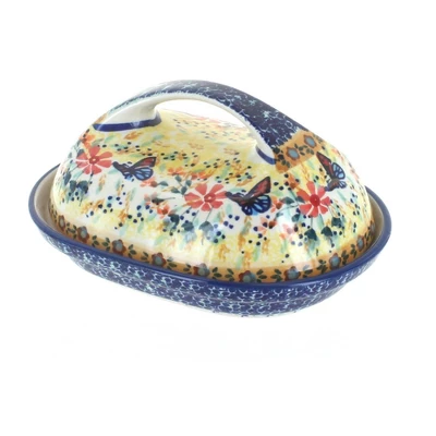 Covered dish with convenient handle keeps butter fresh for starting your morning or passing around the dinner table. Each piece is handcrafted and painted for an artisan finish. Dishwasher safe. 5 inches x 7 inches. Inside is 5 inches x 3.25 inches. The Art of Polish Pottery, as we know it today, started as local folk art centuries ago in the German province of Silesia. The first known pieces of “Bunzlauer” stoneware dating back to the 16th century were crafted by hand and decorated with a folk art stamping technique using potatoes. Original designs were inspired by the peacock feather using the colors of cobalt blue, sage green and ferrous red. These designs and colors are still the inspiration for modern day patterns.Today, skilled Polish artists still individually handcraft and hand decorate each piece using small sponges to stamp each pattern and color. After the process of mixing ingredients, molding the pottery, applying the decorations and glaze, the pottery is twice fired. This process makes the pottery extremely durable, it will not crack or chip easily, and it is perfect for use in the microwave, dishwasher, oven and freezer. Along with our pottery, we have sourced a range of absolutely beautiful hand blown glassware from Poland. It is the perfect addition to your Polish Pottery Collection!