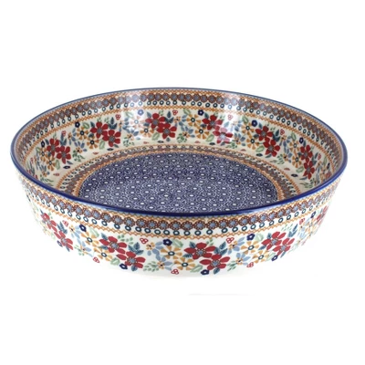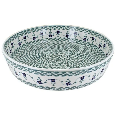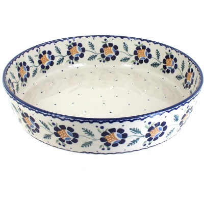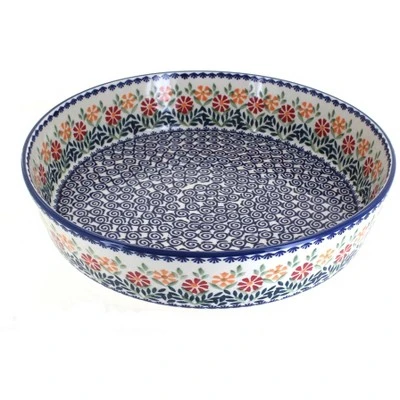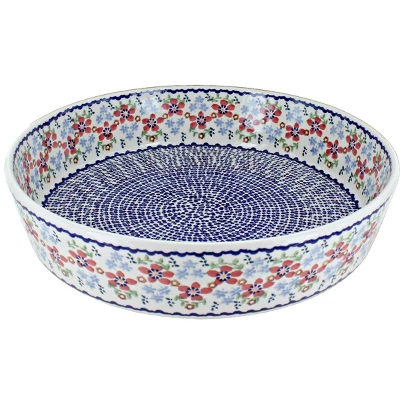 Large Round Baking Dish – great for your favorite dessert – or any casserole. 12″ diameter x 3″ deep. The Art of Polish Pottery, as we know it today, started as local folk art centuries ago in the German province of Silesia. The first known pieces of “Bunzlauer” stoneware dating back to the 16th century were crafted by hand and decorated with a folk art stamping technique using potatoes. Original designs were inspired by the peacock feather using the colors of cobalt blue, sage green and ferrous red. These designs and colors are still the inspiration for modern day patterns.Today, skilled Polish artists still individually handcraft and hand decorate each piece using small sponges to stamp each pattern and color. After the process of mixing ingredients, molding the pottery, applying the decorations and glaze, the pottery is twice fired. This process makes the pottery extremely durable, it will not crack or chip easily, and it is perfect for use in the microwave, dishwasher, oven and freezer. Along with our pottery, we have sourced a range of absolutely beautiful hand blown glassware from Poland. It is the perfect addition to your Polish Pottery Collection!
