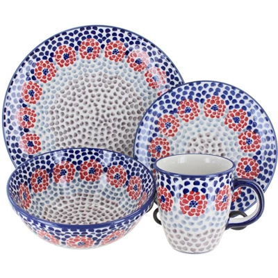 Hand crafted by artists in Poland, heirloom quality dishes are made with your everyday life in mind. Durable high-fired ceramic with a glossy finish is safe for the dishwasher and microwave. Includes 4 dinner plates, dessert plates, coffee mugs and cereal/soup bowls Dinner Plate – 10″ diameter Dessert Plate – 7″ diameter Cereal Bowl – 6.5″ diameter, 2.5″ deep Coffee Mug – 8 oz. capacity, 3.75″ high The Art of Polish Pottery, as we know it today, started as local folk art centuries ago in the German province of Silesia. The first known pieces of “Bunzlauer” stoneware dating back to the 16th century were crafted by hand and decorated with a folk art stamping technique using potatoes. Original designs were inspired by the peacock feather using the colors of cobalt blue, sage green and ferrous red. These designs and colors are still the inspiration for modern day patterns.Today, skilled Polish artists still individually handcraft and hand decorate each piece using small sponges to stamp each pattern and color. After the process of mixing ingredients, molding the pottery, applying the decorations and glaze, the pottery is twice fired. This process makes the pottery extremely durable, it will not crack or chip easily, and it is perfect for use in the microwave, dishwasher, oven and freezer. Along with our pottery, we have sourced a range of absolutely beautiful hand blown glassware from Poland. It is the perfect addition to your Polish Pottery Collection!