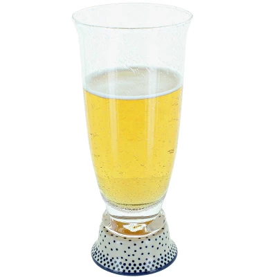 From Manufaktura – Beer Glass with Polish Pottery bottom – matches your pottery perfectly! Beautiful seeded handblown glassware is 8″ tall. 16 oz capacity. A perfect gift for any collector! The Art of Polish Pottery, as we know it today, started as local folk art centuries ago in the German province of Silesia. The first known pieces of “Bunzlauer” stoneware dating back to the 16th century were crafted by hand and decorated with a folk art stamping technique using potatoes. Original designs were inspired by the peacock feather using the colors of cobalt blue, sage green and ferrous red. These designs and colors are still the inspiration for modern day patterns.Today, skilled Polish artists still individually handcraft and hand decorate each piece using small sponges to stamp each pattern and color. After the process of mixing ingredients, molding the pottery, applying the decorations and glaze, the pottery is twice fired. This process makes the pottery extremely durable, it will not crack or chip easily, and it is perfect for use in the microwave, dishwasher, oven and freezer. Along with our pottery, we have sourced a range of absolutely beautiful hand blown glassware from Poland. It is the perfect addition to your Polish Pottery Collection!