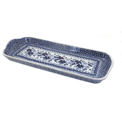 From Manufaktura – 14.25″ long, 6.25″ wide, 1″ deep The Art of Polish Pottery, as we know it today, started as local folk art centuries ago in the German province of Silesia. The first known pieces of “Bunzlauer” stoneware dating back to the 16th century were crafted by hand and decorated with a folk art stamping technique using potatoes. Original designs were inspired by the peacock feather using the colors of cobalt blue, sage green and ferrous red. These designs and colors are still the inspiration for modern day patterns.Today, skilled Polish artists still individually handcraft and hand decorate each piece using small sponges to stamp each pattern and color. After the process of mixing ingredients, molding the pottery, applying the decorations and glaze, the pottery is twice fired. This process makes the pottery extremely durable, it will not crack or chip easily, and it is perfect for use in the microwave, dishwasher, oven and freezer. Along with our pottery, we have sourced a range of absolutely beautiful hand blown glassware from Poland. It is the perfect addition to your Polish Pottery Collection!