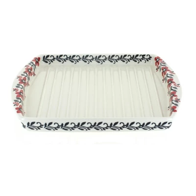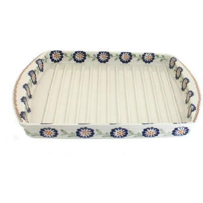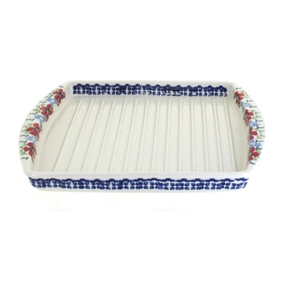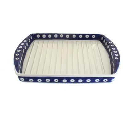 Crafted from durable ceramic, bacon cookers from Manufaktura are a breakfast essential. Makes 5-6 pieces of bacon just the way you want it in the microwave. The double glaze finish resists stains and allows for an easy cleanup in the dishwasher. Choose from any of our hand-painted designs to match your kitchen decor! 10.25 inches long x 8.25 inches wide The Art of Polish Pottery, as we know it today, started as local folk art centuries ago in the German province of Silesia. The first known pieces of “Bunzlauer” stoneware dating back to the 16th century were crafted by hand and decorated with a folk art stamping technique using potatoes. Original designs were inspired by the peacock feather using the colors of cobalt blue, sage green and ferrous red. These designs and colors are still the inspiration for modern day patterns.Today, skilled Polish artists still individually handcraft and hand decorate each piece using small sponges to stamp each pattern and color. After the process of mixing ingredients, molding the pottery, applying the decorations and glaze, the pottery is twice fired. This process makes the pottery extremely durable, it will not crack or chip easily, and it is perfect for use in the microwave, dishwasher, oven and freezer. Along with our pottery, we have sourced a range of absolutely beautiful hand blown glassware from Poland. It is the perfect addition to your Polish Pottery Collection!