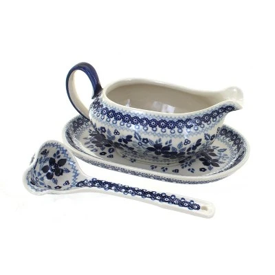 A classic gravy boat is an essential piece for Holiday dinners, gravy for biscuits, or chocolate sauce. Comes with a matching plate and ladle. Plate 8.25 inches x 5.5 inches, gravy boat 1.5 cup capacity, ladle 7 inches long. The Art of Polish Pottery, as we know it today, started as local folk art centuries ago in the German province of Silesia. The first known pieces of “Bunzlauer” stoneware dating back to the 16th century were crafted by hand and decorated with a folk art stamping technique using potatoes. Original designs were inspired by the peacock feather using the colors of cobalt blue, sage green and ferrous red. These designs and colors are still the inspiration for modern day patterns.Today, skilled Polish artists still individually handcraft and hand decorate each piece using small sponges to stamp each pattern and color. After the process of mixing ingredients, molding the pottery, applying the decorations and glaze, the pottery is twice fired. This process makes the pottery extremely durable, it will not crack or chip easily, and it is perfect for use in the microwave, dishwasher, oven and freezer. Along with our pottery, we have sourced a range of absolutely beautiful hand blown glassware from Poland. It is the perfect addition to your Polish Pottery Collection!