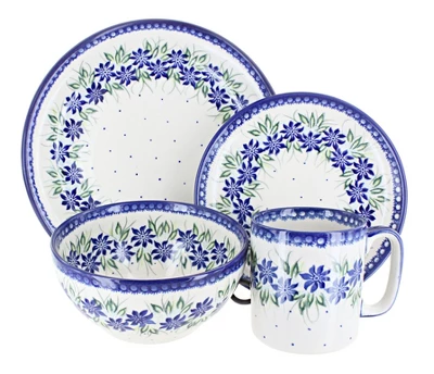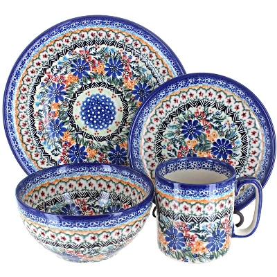 16 piece dinnerware set – includes 4 dinner plates, 4 dessert plates, 4 cereal/soup bowls and 4 coffee mugs Dinner Plate – 10″ diameter Dessert Plate – 7.5″ diameter Cereal Bowl – 6″ diameter x 3″ deep Coffee Mug – 3.75″ tall, 12 oz. capacity The Art of Polish Pottery, as we know it today, started as local folk art centuries ago in the German province of Silesia. The first known pieces of “Bunzlauer” stoneware dating back to the 16th century were crafted by hand and decorated with a folk art stamping technique using potatoes. Original designs were inspired by the peacock feather using the colors of cobalt blue, sage green and ferrous red. These designs and colors are still the inspiration for modern day patterns.Today, skilled Polish artists still individually handcraft and hand decorate each piece using small sponges to stamp each pattern and color. After the process of mixing ingredients, molding the pottery, applying the decorations and glaze, the pottery is twice fired. This process makes the pottery extremely durable, it will not crack or chip easily, and it is perfect for use in the microwave, dishwasher, oven and freezer. Along with our pottery, we have sourced a range of absolutely beautiful hand blown glassware from Poland. It is the perfect addition to your Polish Pottery Collection!