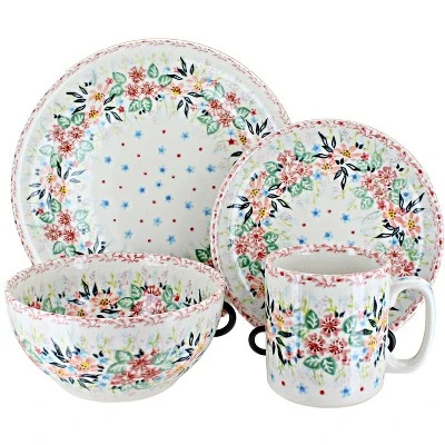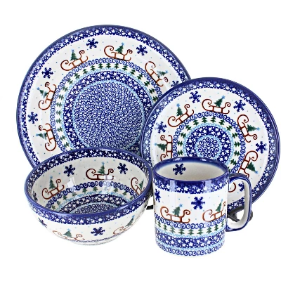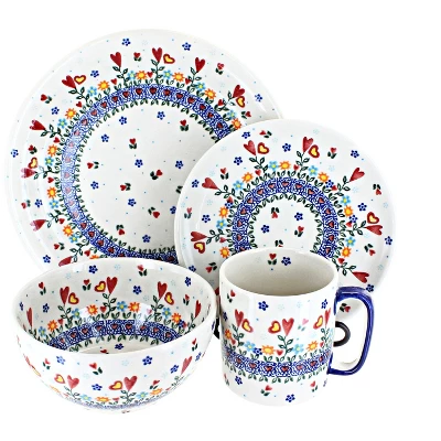 4 piece place setting – includes 1 dinner plate, 1 dessert plate, 1 cereal/soup bowl, and 1 coffee mugDinner Plate – 10″ diameterDessert Plate – 7.5″ diameterCereal Bowl – 6″ diameter x 3″ deepCoffee Mug – 3.75″ tall, 12 oz. capacity The Art of Polish Pottery, as we know it today, started as local folk art centuries ago in the German province of Silesia. The first known pieces of “Bunzlauer” stoneware dating back to the 16th century were crafted by hand and decorated with a folk art stamping technique using potatoes. Original designs were inspired by the peacock feather using the colors of cobalt blue, sage green and ferrous red. These designs and colors are still the inspiration for modern day patterns.Today, skilled Polish artists still individually handcraft and hand decorate each piece using small sponges to stamp each pattern and color. After the process of mixing ingredients, molding the pottery, applying the decorations and glaze, the pottery is twice fired. This process makes the pottery extremely durable, it will not crack or chip easily, and it is perfect for use in the microwave, dishwasher, oven and freezer. Along with our pottery, we have sourced a range of absolutely beautiful hand blown glassware from Poland. It is the perfect addition to your Polish Pottery Collection!